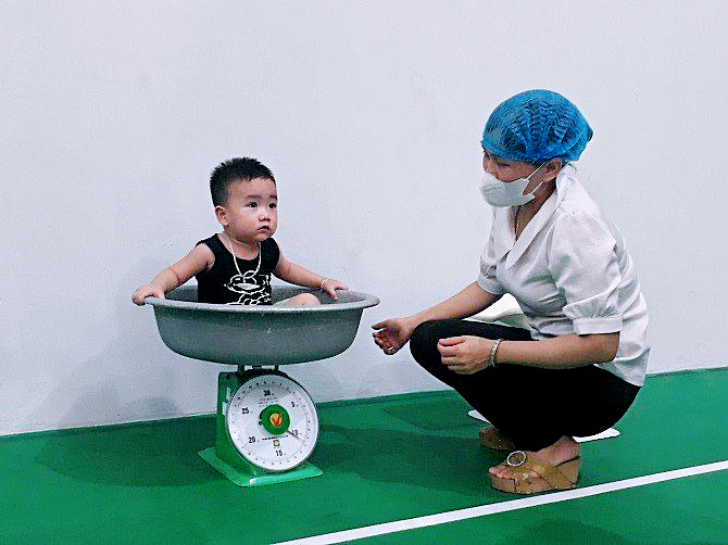 Các trẻ được cân nặng để tư vấn, đánh giá thể trạng dinh dưỡng của trẻ.