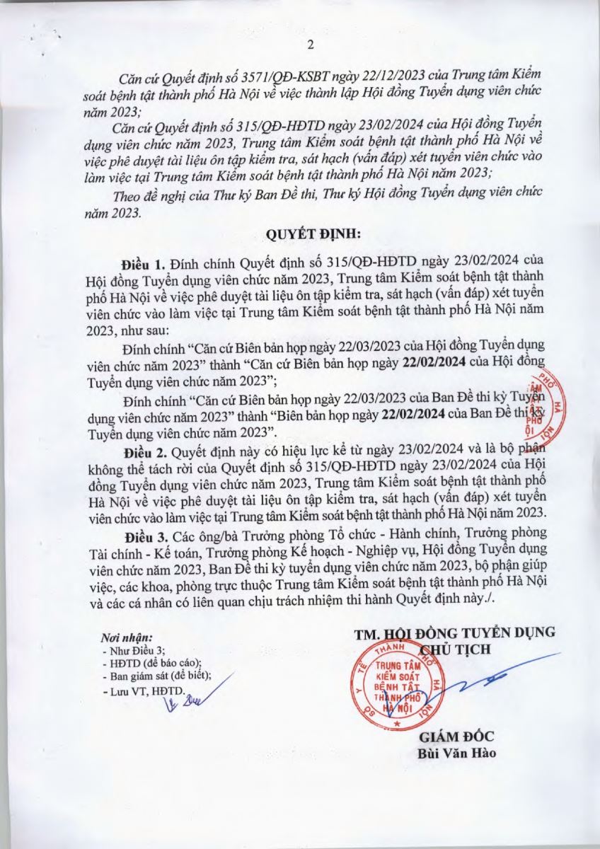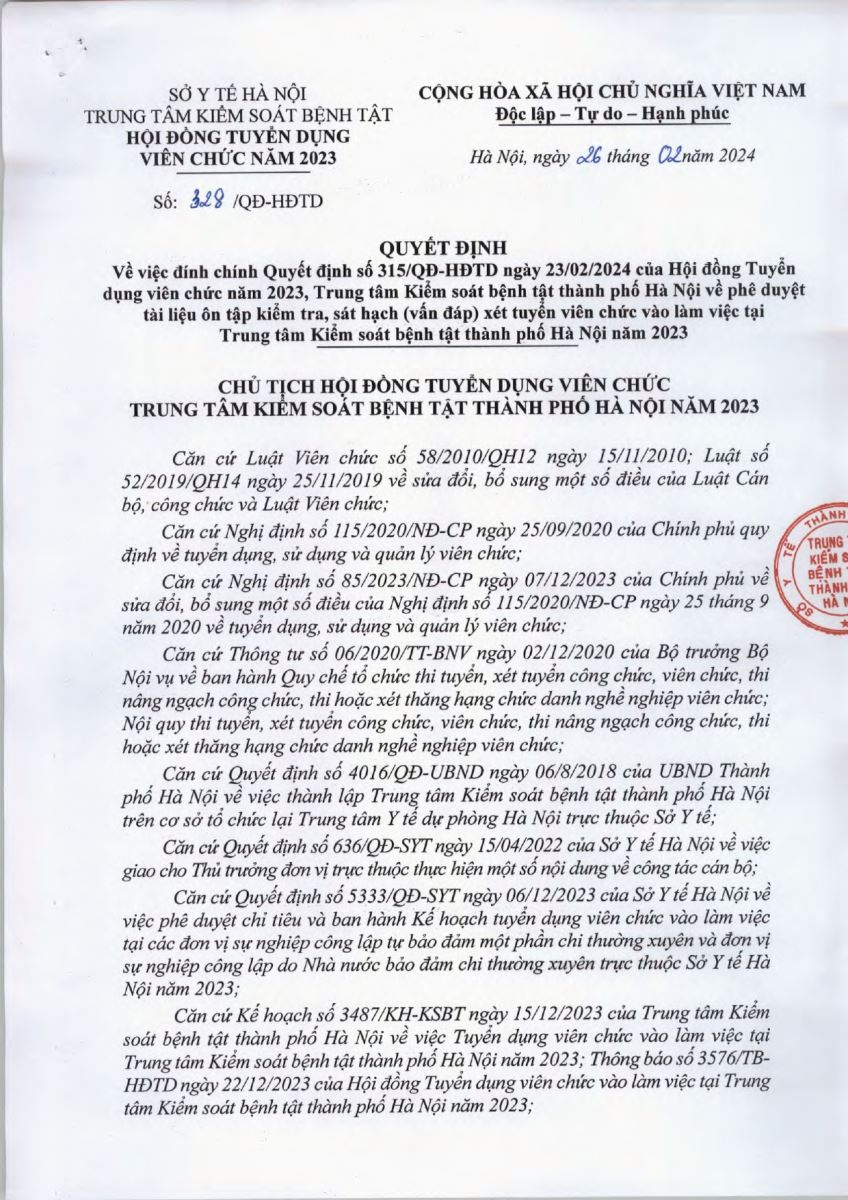 Quyết định về việc đính chính Quyết định số 315/QĐ-HĐTD ngày 23/2/2024 của Hội đồng tuyển dụng viên chức năm 2023, Trung tâm Kiểm soát bệnh tật thành phố Hà Nội về phê duyệt tài liệu ôn tập kiểm tra, sát hạch (vấn đáp) xét tuyển viên chức vào làm việc tại trung tâm Kiểm soát bệnh tật thành phố Hà Nội năm 2023