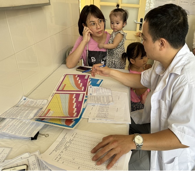 Các y bác sĩ Trạm y tế phường Hàng Bột quận Đống Đa tư vấn cho các mẹ chế độ dinh dưỡng sau khi trẻ được uống Vitamin A.