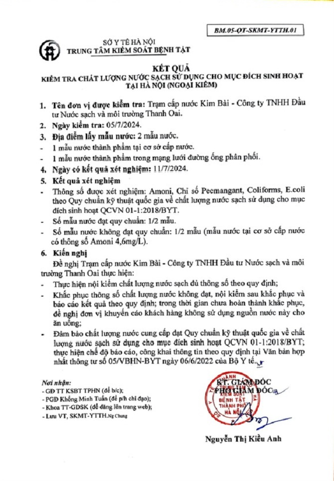 Kết quả kiểm tra chất lượng nước sạch sử dụng cho mục đích sinh hoạt của Trạm cấp nước Kim Bài - Công ty TNHH đầu tư Nước sạch và môi trường Thanh Oai