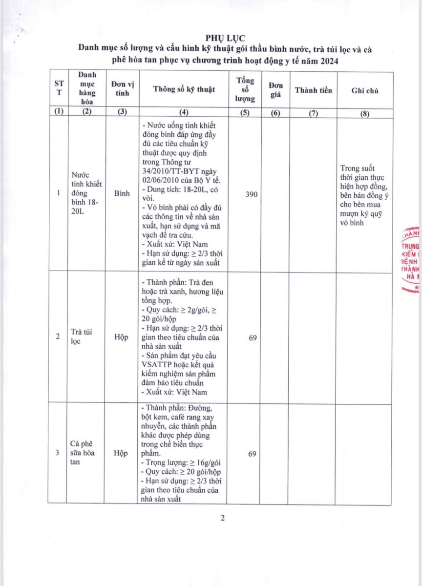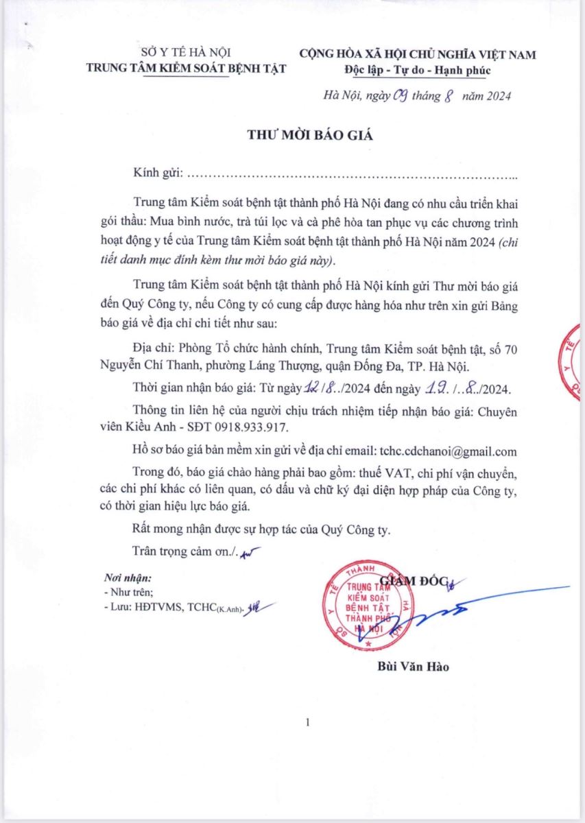 Thư mời báo giá về nhu cầu triển khai gói thầu: Mua bình nước, trà túi lọc và cà phê hòa tan phục vụ các chương trình hoạt động y tế của Trung tâm Kiểm soát bệnh tật thành phố HN năm 2024