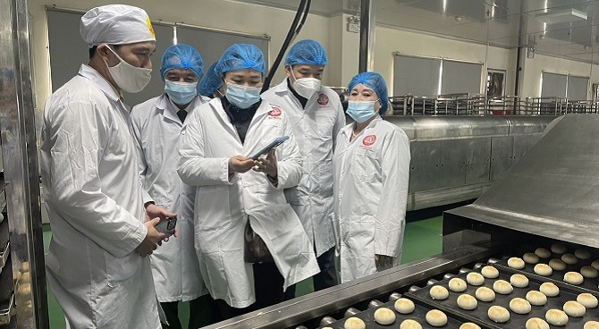 Đoàn kiểm tra thực tế tại Công ty Cổ phần bánh mứt kẹo Bảo Minh tại Khu Công nghiệp Nam Thăng Long.