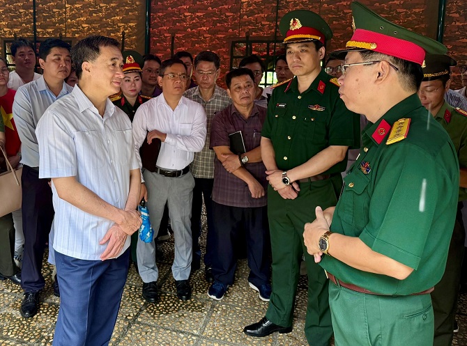 Thứ trưởng Bộ Y tế Trần Văn Thuấn nghe Đại tá Lê Văn Đông - Phó Cục trưởng Cục Quân y (Bộ Quốc phòng) báo cáo công tác y tế đảm nhiệm sự kiện A80 của lực lượng quân y tại trạm cấp cứu.