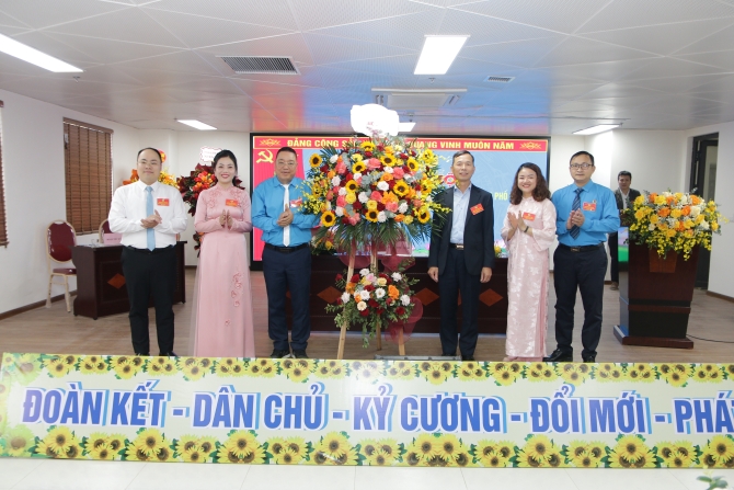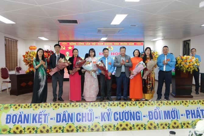 Các đồng chí trong Ban Giám đốc Trung tâm tặng hoa chúc mừng Ban Chấp hành Công đoàn, nhiệm kỳ 2025 - 2030 ra mắt Đại hội.