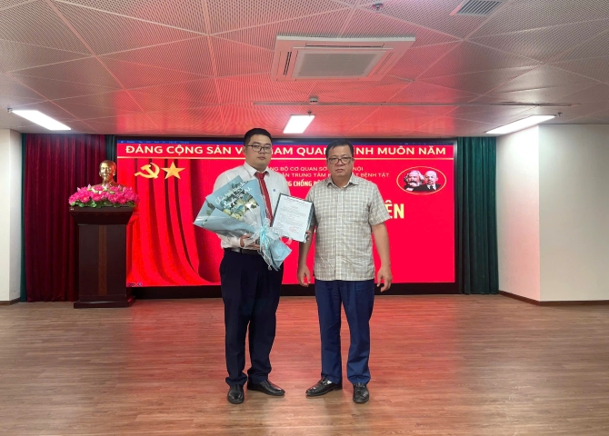 Đồng chí Bùi Văn Hào - Bí thư Đảng bộ bộ phận, Giám đốc Trung tâm Kiểm soát bệnh tật thành phố Hà Nội trao Quyết định kết nạp Đảng cho đồng chí Nguyễn Việt Anh.