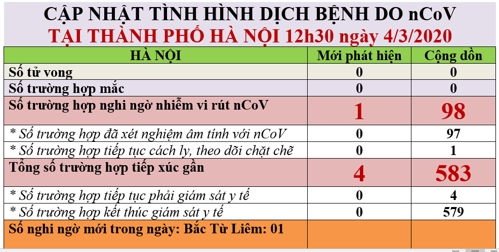 CẬP NHẬT TÌNH HÌNH DỊCH BỆNH DO COVID-19 TẠI THÀNH PHỐ HÀ NỘI NGÀY 04/3/2020